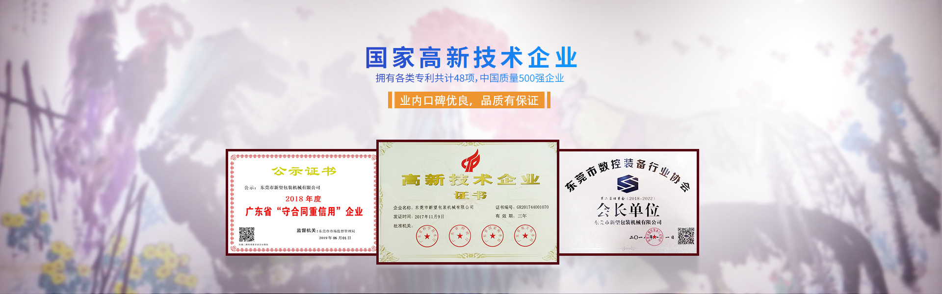 新望機(jī)械成立于1998年,位于東莞市東部工業(yè)園區(qū)的中心地帶——企石鎮(zhèn)東平村,交通方便、環(huán)境優(yōu)美舒適、視野開(kāi)闊。公司注冊(cè)資本2000萬(wàn)元,擁有辦公室、廠(chǎng)房等18,000多平方米。已通過(guò)ISO9001:2015國(guó)際質(zhì)量管理體系認(rèn)證,擁有國(guó)家各類(lèi)專(zhuān)利共計(jì)58項(xiàng)。是東莞市企石鎮(zhèn)工商聯(lián)副會(huì)長(zhǎng)單位、東莞市企石鎮(zhèn)文學(xué)藝術(shù)界聯(lián)合會(huì)副主席單位、東莞市環(huán)保包裝行業(yè)協(xié)會(huì)副會(huì)長(zhǎng)單位、東莞市數(shù)控裝備行業(yè)協(xié)會(huì)第二屆會(huì)長(zhǎng)單位、廣東省包裝技術(shù)協(xié)會(huì)常務(wù)理事單位、廣東省膠粘劑行業(yè)協(xié)會(huì)理事單位、廣東省著名商標(biāo)企業(yè)、國(guó)家高新技術(shù)企業(yè)。