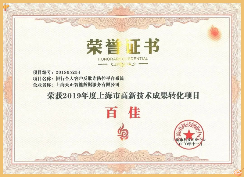 上海市高新技術成果轉(zhuǎn)化百佳榮譽